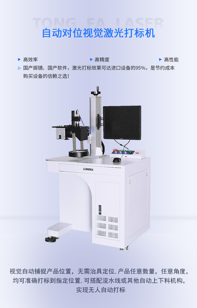 通發(fā)激光研發(fā)的自動對位視覺激光打標(biāo)機(jī)TFL-F20CY-ZD,視覺自動捕捉產(chǎn)品位置,無需治具定位,產(chǎn)品任意數(shù)量,任意角度,均可準(zhǔn)確打標(biāo)到指定位置,可搭配流水線或其他自動上下料機(jī)構(gòu),節(jié)省人力,實現(xiàn)無人自動打標(biāo),可搭配流水線或其他自動上下料機(jī)構(gòu),節(jié)省人力,實現(xiàn)無人自動打標(biāo),極高的重復(fù)頻率,打標(biāo)速度快;極高的光學(xué)質(zhì)量,實現(xiàn)精細(xì)打標(biāo),可與光纖、CO2、半導(dǎo)體等各種波長的激光光路集成.